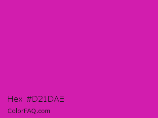Hex #d21dae Color is a normal magenta color and the nearest color is Byzantine #bd33a4. Hex code #d21dae and RGB value is rgb(210,29,174). In RGB color space, this color is composed of 82% red, 11% green, 68% blue, In CMYK color space, this color is composed of 0% cyan, 86% magenta, 17% yellow , 18% black , In HSL color space, this color has a hue angle of 312° , 76% saturation and 47% lightness.