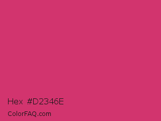 Hex #d2346e Color is a normal rose color and the nearest color is Telemagenta #cf3476. Hex code #d2346e and RGB value is rgb(210,52,110). In RGB color space, this color is composed of 82% red, 20% green, 43% blue, In CMYK color space, this color is composed of 0% cyan, 75% magenta, 48% yellow , 18% black , In HSL color space, this color has a hue angle of 338° , 64% saturation and 51% lightness.