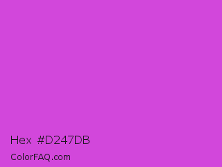 Hex #d247db Color is a normal magenta color and the nearest color is Steel Pink #cc33cc. Hex code #d247db and RGB value is rgb(210,71,219). In RGB color space, this color is composed of 82% red, 28% green, 86% blue, In CMYK color space, this color is composed of 4% cyan, 68% magenta, 0% yellow , 14% black , In HSL color space, this color has a hue angle of 296° , 67% saturation and 57% lightness.