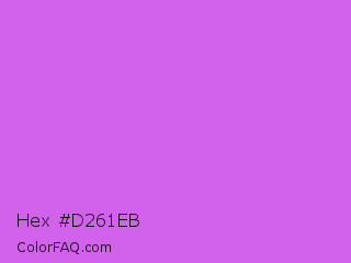 Hex #d261eb Color is a light purple color and the nearest color is Orchid #da70d6. Hex code #d261eb and RGB value is rgb(210,97,235). In RGB color space, this color is composed of 82% red, 38% green, 92% blue, In CMYK color space, this color is composed of 11% cyan, 59% magenta, 0% yellow , 8% black , In HSL color space, this color has a hue angle of 289° , 78% saturation and 65% lightness.