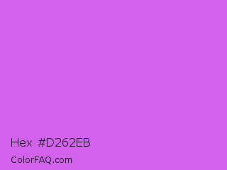 Hex #d262eb Color is a light purple color and the nearest color is Orchid #da70d6. Hex code #d262eb and RGB value is rgb(210,98,235). In RGB color space, this color is composed of 82% red, 38% green, 92% blue, In CMYK color space, this color is composed of 11% cyan, 58% magenta, 0% yellow , 8% black , In HSL color space, this color has a hue angle of 289° , 77% saturation and 65% lightness.