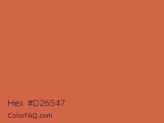 Hex #d26547 Color is a normal red color and the nearest color is Red Damask #da6a41. Hex code #d26547 and RGB value is rgb(210,101,71). In RGB color space, this color is composed of 82% red, 40% green, 28% blue, In CMYK color space, this color is composed of 0% cyan, 52% magenta, 66% yellow , 18% black , In HSL color space, this color has a hue angle of 13° , 61% saturation and 55% lightness.