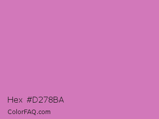 Hex #d278ba Color is a light magenta color and the nearest color is Middle Purple #d982b5. Hex code #d278ba and RGB value is rgb(210,120,186). In RGB color space, this color is composed of 82% red, 47% green, 73% blue, In CMYK color space, this color is composed of 0% cyan, 43% magenta, 11% yellow , 18% black , In HSL color space, this color has a hue angle of 316° , 50% saturation and 65% lightness.