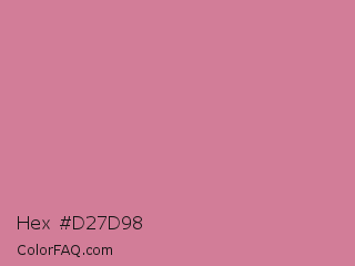Hex #d27d98 Color is a light rose color and the nearest color is Charm #d47494. Hex code #d27d98 and RGB value is rgb(210,125,152). In RGB color space, this color is composed of 82% red, 49% green, 60% blue, In CMYK color space, this color is composed of 0% cyan, 40% magenta, 28% yellow , 18% black , In HSL color space, this color has a hue angle of 341° , 49% saturation and 66% lightness.