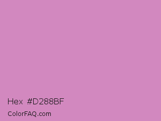 Hex #d288bf Color is a light magenta color and the nearest color is Middle Purple #d982b5. Hex code #d288bf and RGB value is rgb(210,136,191). In RGB color space, this color is composed of 82% red, 53% green, 75% blue, In CMYK color space, this color is composed of 0% cyan, 35% magenta, 9% yellow , 18% black , In HSL color space, this color has a hue angle of 315° , 45% saturation and 68% lightness.