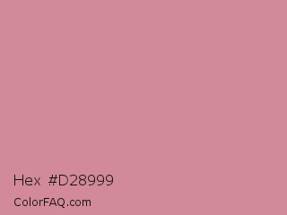 Hex #d28999 Color is a light red color and the nearest color is Puce #cc8899. Hex code #d28999 and RGB value is rgb(210,137,153). In RGB color space, this color is composed of 82% red, 54% green, 60% blue, In CMYK color space, this color is composed of 0% cyan, 35% magenta, 27% yellow , 18% black , In HSL color space, this color has a hue angle of 347° , 45% saturation and 68% lightness.