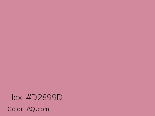 Hex #d2899d Color is a light rose color and the nearest color is Puce #cc8899. Hex code #d2899d and RGB value is rgb(210,137,157). In RGB color space, this color is composed of 82% red, 54% green, 62% blue, In CMYK color space, this color is composed of 0% cyan, 35% magenta, 25% yellow , 18% black , In HSL color space, this color has a hue angle of 344° , 45% saturation and 68% lightness.