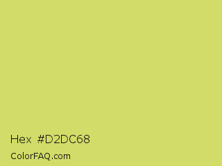 Hex #d2dc68 Color is a light yellow color and the nearest color is Booger Buster #dde26a. Hex code #d2dc68 and RGB value is rgb(210,220,104). In RGB color space, this color is composed of 82% red, 86% green, 41% blue, In CMYK color space, this color is composed of 5% cyan, 0% magenta, 53% yellow , 14% black , In HSL color space, this color has a hue angle of 65° , 62% saturation and 64% lightness.