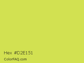 Hex #d2e151 Color is a normal yellow color and the nearest color is Maximum Green Yellow #d9e650. Hex code #d2e151 and RGB value is rgb(210,225,81). In RGB color space, this color is composed of 82% red, 88% green, 32% blue, In CMYK color space, this color is composed of 7% cyan, 0% magenta, 64% yellow , 12% black , In HSL color space, this color has a hue angle of 66° , 71% saturation and 60% lightness.