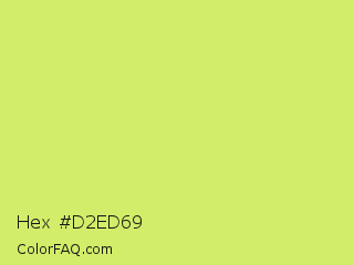 Hex #d2ed69 Color is a light lime color and the nearest color is Booger Buster #dde26a. Hex code #d2ed69 and RGB value is rgb(210,237,105). In RGB color space, this color is composed of 82% red, 93% green, 41% blue, In CMYK color space, this color is composed of 11% cyan, 0% magenta, 56% yellow , 7% black , In HSL color space, this color has a hue angle of 72° , 79% saturation and 67% lightness.