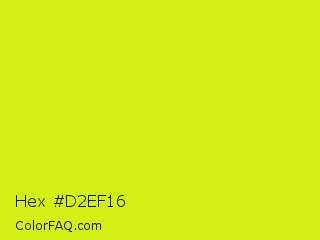 Hex #d2ef16 Color is a normal yellow color and the nearest color is Las Palmas #c6e610. Hex code #d2ef16 and RGB value is rgb(210,239,22). In RGB color space, this color is composed of 82% red, 94% green, 9% blue, In CMYK color space, this color is composed of 12% cyan, 0% magenta, 91% yellow , 6% black , In HSL color space, this color has a hue angle of 68° , 87% saturation and 51% lightness.