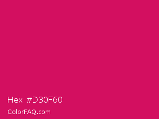 Hex #d30f60 Color is a normal rose color and the nearest color is Dogwood Rose #d71868. Hex code #d30f60 and RGB value is rgb(211,15,96). In RGB color space, this color is composed of 83% red, 6% green, 38% blue, In CMYK color space, this color is composed of 0% cyan, 93% magenta, 55% yellow , 17% black , In HSL color space, this color has a hue angle of 335° , 87% saturation and 44% lightness.
