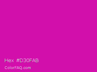 Hex #d30fab Color is a normal magenta color and the nearest color is Deep Magenta #cc00cc. Hex code #d30fab and RGB value is rgb(211,15,171). In RGB color space, this color is composed of 83% red, 6% green, 67% blue, In CMYK color space, this color is composed of 0% cyan, 93% magenta, 19% yellow , 17% black , In HSL color space, this color has a hue angle of 312° , 87% saturation and 44% lightness.