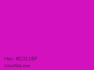 Hex #d311bf Color is a normal magenta color and the nearest color is Deep Magenta #cc00cc. Hex code #d311bf and RGB value is rgb(211,17,191). In RGB color space, this color is composed of 83% red, 7% green, 75% blue, In CMYK color space, this color is composed of 0% cyan, 92% magenta, 9% yellow , 17% black , In HSL color space, this color has a hue angle of 306° , 85% saturation and 45% lightness.