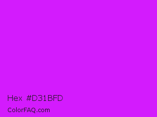 Hex #d31bfd Color is a normal purple color and the nearest color is Vivid Orchid #cc00ff. Hex code #d31bfd and RGB value is rgb(211,27,253). In RGB color space, this color is composed of 83% red, 11% green, 99% blue, In CMYK color space, this color is composed of 17% cyan, 89% magenta, 0% yellow , 1% black , In HSL color space, this color has a hue angle of 289° , 98% saturation and 55% lightness.