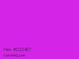 Hex #d324e7 Color is a normal magenta color and the nearest color is Steel Pink #cc33cc. Hex code #d324e7 and RGB value is rgb(211,36,231). In RGB color space, this color is composed of 83% red, 14% green, 91% blue, In CMYK color space, this color is composed of 9% cyan, 84% magenta, 0% yellow , 9% black , In HSL color space, this color has a hue angle of 294° , 80% saturation and 52% lightness.