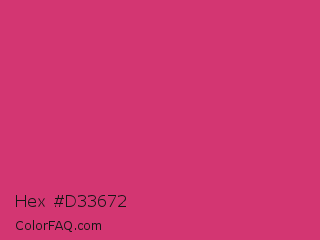 Hex #d33672 Color is a normal rose color and the nearest color is Telemagenta #cf3476. Hex code #d33672 and RGB value is rgb(211,54,114). In RGB color space, this color is composed of 83% red, 21% green, 45% blue, In CMYK color space, this color is composed of 0% cyan, 74% magenta, 46% yellow , 17% black , In HSL color space, this color has a hue angle of 337° , 64% saturation and 52% lightness.