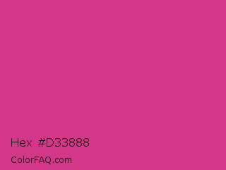 Hex #d33888 Color is a normal rose color and the nearest color is Magenta Pink #cc338b. Hex code #d33888 and RGB value is rgb(211,56,136). In RGB color space, this color is composed of 83% red, 22% green, 53% blue, In CMYK color space, this color is composed of 0% cyan, 73% magenta, 36% yellow , 17% black , In HSL color space, this color has a hue angle of 329° , 64% saturation and 52% lightness.