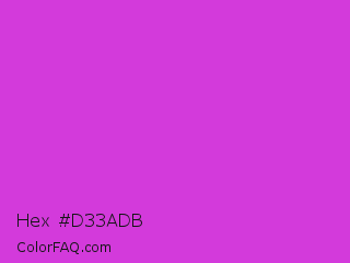 Hex #d33adb Color is a normal magenta color and the nearest color is Steel Pink #cc33cc. Hex code #d33adb and RGB value is rgb(211,58,219). In RGB color space, this color is composed of 83% red, 23% green, 86% blue, In CMYK color space, this color is composed of 4% cyan, 74% magenta, 0% yellow , 14% black , In HSL color space, this color has a hue angle of 297° , 69% saturation and 54% lightness.