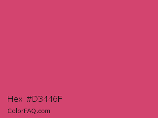 Hex #d3446f Color is a normal rose color and the nearest color is Cabaret #d94972. Hex code #d3446f and RGB value is rgb(211,68,111). In RGB color space, this color is composed of 83% red, 27% green, 44% blue, In CMYK color space, this color is composed of 0% cyan, 68% magenta, 47% yellow , 17% black , In HSL color space, this color has a hue angle of 342° , 62% saturation and 55% lightness.