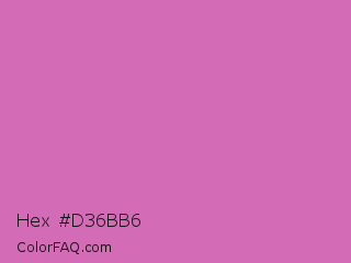 Hex #d36bb6 Color is a light magenta color and the nearest color is Sky Magenta #cf71af. Hex code #d36bb6 and RGB value is rgb(211,107,182). In RGB color space, this color is composed of 83% red, 42% green, 71% blue, In CMYK color space, this color is composed of 0% cyan, 49% magenta, 14% yellow , 17% black , In HSL color space, this color has a hue angle of 317° , 54% saturation and 62% lightness.