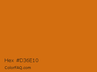Hex #d36e10 Color is a normal orange color and the nearest color is Hot Cinnamon #d2691e. Hex code #d36e10 and RGB value is rgb(211,110,16). In RGB color space, this color is composed of 83% red, 43% green, 6% blue, In CMYK color space, this color is composed of 0% cyan, 48% magenta, 92% yellow , 17% black , In HSL color space, this color has a hue angle of 29° , 86% saturation and 45% lightness.