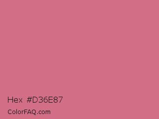 Hex #d36e87 Color is a light red color and the nearest color is Charm #d47494. Hex code #d36e87 and RGB value is rgb(211,110,135). In RGB color space, this color is composed of 83% red, 43% green, 53% blue, In CMYK color space, this color is composed of 0% cyan, 48% magenta, 36% yellow , 17% black , In HSL color space, this color has a hue angle of 345° , 53% saturation and 63% lightness.