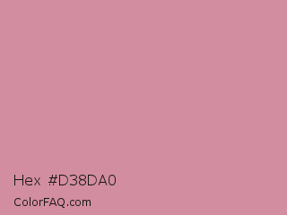 Hex #d38da0 Color is a light rose color and the nearest color is Can Can #d591a4. Hex code #d38da0 and RGB value is rgb(211,141,160). In RGB color space, this color is composed of 83% red, 55% green, 63% blue, In CMYK color space, this color is composed of 0% cyan, 33% magenta, 24% yellow , 17% black , In HSL color space, this color has a hue angle of 344° , 44% saturation and 69% lightness.