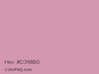 Hex #d398b0 Color is a light rose color and the nearest color is Careys Pink #d29eaa. Hex code #d398b0 and RGB value is rgb(211,152,176). In RGB color space, this color is composed of 83% red, 60% green, 69% blue, In CMYK color space, this color is composed of 0% cyan, 28% magenta, 17% yellow , 17% black , In HSL color space, this color has a hue angle of 336° , 40% saturation and 71% lightness.