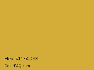 Hex #d3ad38 Color is a normal orange color and the nearest color is Gold Metallic #d4af37. Hex code #d3ad38 and RGB value is rgb(211,173,56). In RGB color space, this color is composed of 83% red, 68% green, 22% blue, In CMYK color space, this color is composed of 0% cyan, 18% magenta, 73% yellow , 17% black , In HSL color space, this color has a hue angle of 45° , 64% saturation and 52% lightness.