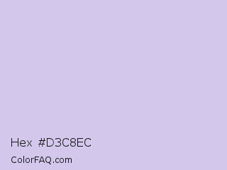 Hex #d3c8ec Color is a very light indigo color and the nearest color is Soap #cec8ef. Hex code #d3c8ec and RGB value is rgb(211,200,236). In RGB color space, this color is composed of 83% red, 78% green, 93% blue, In CMYK color space, this color is composed of 11% cyan, 15% magenta, 0% yellow , 7% black , In HSL color space, this color has a hue angle of 258° , 49% saturation and 85% lightness.