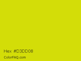 Hex #d3dd08 Color is a normal yellow color and the nearest color is Bitter Lemon #cae00d. Hex code #d3dd08 and RGB value is rgb(211,221,8). In RGB color space, this color is composed of 83% red, 87% green, 3% blue, In CMYK color space, this color is composed of 5% cyan, 0% magenta, 96% yellow , 13% black , In HSL color space, this color has a hue angle of 63° , 93% saturation and 45% lightness.