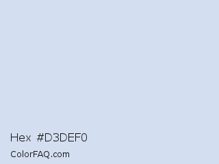Hex #d3def0 Color is a very light blue color and the nearest color is Link Water #d9e4f5. Hex code #d3def0 and RGB value is rgb(211,222,240). In RGB color space, this color is composed of 83% red, 87% green, 94% blue, In CMYK color space, this color is composed of 12% cyan, 8% magenta, 0% yellow , 6% black , In HSL color space, this color has a hue angle of 217° , 49% saturation and 88% lightness.