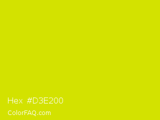 Hex #d3e200 Color is a normal yellow color and the nearest color is Bitter Lemon #cae00d. Hex code #d3e200 and RGB value is rgb(211,226,0). In RGB color space, this color is composed of 83% red, 89% green, 0% blue, In CMYK color space, this color is composed of 7% cyan, 0% magenta, 100% yellow , 11% black , In HSL color space, this color has a hue angle of 64° , 100% saturation and 44% lightness.