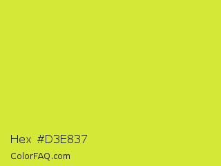 Hex #d3e837 Color is a normal yellow color and the nearest color is Pear #d1e231. Hex code #d3e837 and RGB value is rgb(211,232,55). In RGB color space, this color is composed of 83% red, 91% green, 22% blue, In CMYK color space, this color is composed of 9% cyan, 0% magenta, 76% yellow , 9% black , In HSL color space, this color has a hue angle of 67° , 79% saturation and 56% lightness.