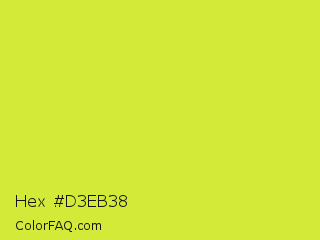 Hex #d3eb38 Color is a normal yellow color and the nearest color is Pear #d1e231. Hex code #d3eb38 and RGB value is rgb(211,235,56). In RGB color space, this color is composed of 83% red, 92% green, 22% blue, In CMYK color space, this color is composed of 10% cyan, 0% magenta, 76% yellow , 8% black , In HSL color space, this color has a hue angle of 68° , 82% saturation and 57% lightness.