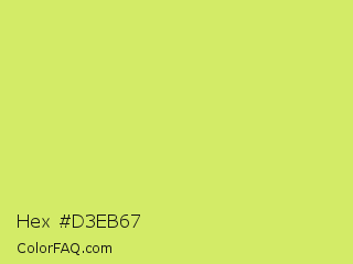 Hex #d3eb67 Color is a light lime color and the nearest color is Booger Buster #dde26a. Hex code #d3eb67 and RGB value is rgb(211,235,103). In RGB color space, this color is composed of 83% red, 92% green, 40% blue, In CMYK color space, this color is composed of 10% cyan, 0% magenta, 56% yellow , 8% black , In HSL color space, this color has a hue angle of 71° , 77% saturation and 66% lightness.