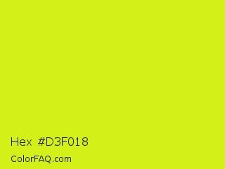 Hex #d3f018 Color is a normal yellow color and the nearest color is Arctic Lime #d0ff14. Hex code #d3f018 and RGB value is rgb(211,240,24). In RGB color space, this color is composed of 83% red, 94% green, 9% blue, In CMYK color space, this color is composed of 12% cyan, 0% magenta, 90% yellow , 6% black , In HSL color space, this color has a hue angle of 68° , 88% saturation and 52% lightness.