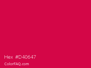 Hex #d40647 Color is a normal rose color and the nearest color is Spanish Carmine #d10047. Hex code #d40647 and RGB value is rgb(212,6,71). In RGB color space, this color is composed of 83% red, 2% green, 28% blue, In CMYK color space, this color is composed of 0% cyan, 97% magenta, 67% yellow , 17% black , In HSL color space, this color has a hue angle of 341° , 94% saturation and 43% lightness.