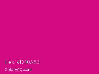 Hex #d40a83 Color is a normal magenta color and the nearest color is Red Violet #c71585. Hex code #d40a83 and RGB value is rgb(212,10,131). In RGB color space, this color is composed of 83% red, 4% green, 51% blue, In CMYK color space, this color is composed of 0% cyan, 95% magenta, 38% yellow , 17% black , In HSL color space, this color has a hue angle of 324° , 91% saturation and 44% lightness.