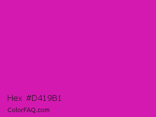 Hex #d419b1 Color is a normal magenta color and the nearest color is Byzantine #bd33a4. Hex code #d419b1 and RGB value is rgb(212,25,177). In RGB color space, this color is composed of 83% red, 10% green, 69% blue, In CMYK color space, this color is composed of 0% cyan, 88% magenta, 17% yellow , 17% black , In HSL color space, this color has a hue angle of 311° , 79% saturation and 46% lightness.