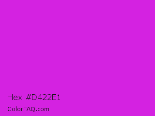 Hex #d422e1 Color is a normal magenta color and the nearest color is Steel Pink #cc33cc. Hex code #d422e1 and RGB value is rgb(212,34,225). In RGB color space, this color is composed of 83% red, 13% green, 88% blue, In CMYK color space, this color is composed of 6% cyan, 85% magenta, 0% yellow , 12% black , In HSL color space, this color has a hue angle of 296° , 76% saturation and 51% lightness.