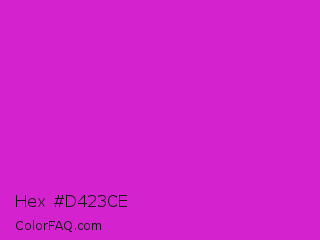 Hex #d423ce Color is a normal magenta color and the nearest color is Steel Pink #cc33cc. Hex code #d423ce and RGB value is rgb(212,35,206). In RGB color space, this color is composed of 83% red, 14% green, 81% blue, In CMYK color space, this color is composed of 0% cyan, 83% magenta, 3% yellow , 17% black , In HSL color space, this color has a hue angle of 302° , 72% saturation and 48% lightness.