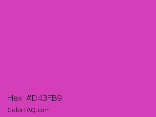 Hex #d43fb9 Color is a normal magenta color and the nearest color is Steel Pink #cc33cc. Hex code #d43fb9 and RGB value is rgb(212,63,185). In RGB color space, this color is composed of 83% red, 25% green, 73% blue, In CMYK color space, this color is composed of 0% cyan, 70% magenta, 13% yellow , 17% black , In HSL color space, this color has a hue angle of 311° , 63% saturation and 54% lightness.