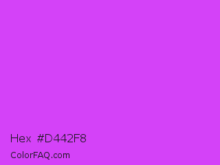 Hex #d442f8 Color is a light purple color and the nearest color is Steel Pink #cc33cc. Hex code #d442f8 and RGB value is rgb(212,66,248). In RGB color space, this color is composed of 83% red, 26% green, 97% blue, In CMYK color space, this color is composed of 15% cyan, 73% magenta, 0% yellow , 3% black , In HSL color space, this color has a hue angle of 288° , 93% saturation and 62% lightness.