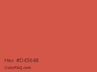 Hex #d45648 Color is a normal red color and the nearest color is Dark Coral #cd5b45. Hex code #d45648 and RGB value is rgb(212,86,72). In RGB color space, this color is composed of 83% red, 34% green, 28% blue, In CMYK color space, this color is composed of 0% cyan, 59% magenta, 66% yellow , 17% black , In HSL color space, this color has a hue angle of 6° , 62% saturation and 56% lightness.