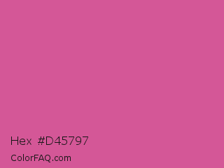 Hex #d45797 Color is a normal rose color and the nearest color is Pink Pantone #d74894. Hex code #d45797 and RGB value is rgb(212,87,151). In RGB color space, this color is composed of 83% red, 34% green, 59% blue, In CMYK color space, this color is composed of 0% cyan, 59% magenta, 29% yellow , 17% black , In HSL color space, this color has a hue angle of 329° , 59% saturation and 59% lightness.