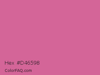 Hex #d46598 Color is a light rose color and the nearest color is Hopbush #d06da1. Hex code #d46598 and RGB value is rgb(212,101,152). In RGB color space, this color is composed of 83% red, 40% green, 60% blue, In CMYK color space, this color is composed of 0% cyan, 52% magenta, 28% yellow , 17% black , In HSL color space, this color has a hue angle of 332° , 56% saturation and 61% lightness.