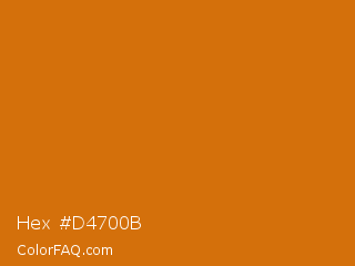 Hex #d4700b Color is a normal orange color and the nearest color is Meteor #d07d12. Hex code #d4700b and RGB value is rgb(212,112,11). In RGB color space, this color is composed of 83% red, 44% green, 4% blue, In CMYK color space, this color is composed of 0% cyan, 47% magenta, 95% yellow , 17% black , In HSL color space, this color has a hue angle of 30° , 90% saturation and 44% lightness.