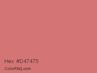 Hex #d47475 Color is a light red color and the nearest color is Candy Pink #e4717a. Hex code #d47475 and RGB value is rgb(212,116,117). In RGB color space, this color is composed of 83% red, 45% green, 46% blue, In CMYK color space, this color is composed of 0% cyan, 45% magenta, 45% yellow , 17% black , In HSL color space, this color has a hue angle of 359° , 53% saturation and 64% lightness.